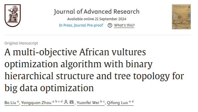 近日,广西民族大学人工智能学院周永权教授团队在智能优化算法及应用领域取得重要研究进展,研究成果以A multi-objective African vultures optimization algorithm with binary hierarchical structure and tree topology for big data optimization为题发表在国际综合性期刊Journal of Advanced Research上。这是我校以第一完成单位、第一通讯单位在该期刊上发表的研究成果。